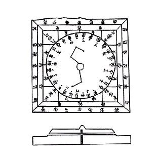 我国古代推算历数或占卜的工具。分天地盘。天盘爲圆形,地盘爲正方形。上面画有北斗和二十八宿的星象、方位,并刻有一百八十二个圆点,代表周天度数的三百六十五又四分一度。