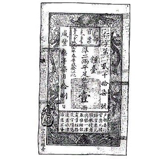 三年(1853年)发行,以银两爲单位。面额分一两、三两、五两、十两和五十两五种。後因发行过滥而贬值,几成废纸。