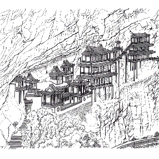 晚期,全寺有殿宇楼阁四十间,陡崖上凿洞穴插悬梁爲基,楼阁之间有栈道相通。寺内各种铜铸、铁铸、泥塑、石雕等像八十余尊,古人题咏镌刻於壁间。