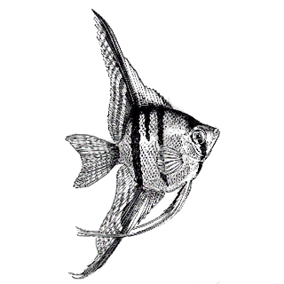 鱼纲,丽鱼科。鱼体略近圆形,高而侧扁,有银白光泽,间有4条黑色横纹,前端的条纹通过眼部,後端的接近尾鳍,中间的2条横贯鱼体中部。各鳍较大,除胸鳍外,一般都有若干枚鳍条延长,似轻飘衣带。鱼体神态潇洒,风韵超逸,被人们作爲观赏鱼类饲养。