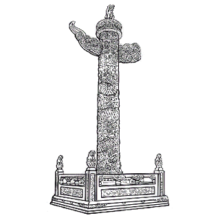 2 古代设在桥梁、宫殿、城垣或陵墓等前兼作装饰用的巨大柱子。设在陵墓前的又名「墓表」。一般爲石造。柱身往往雕有纹饰。北京 天安门前後的两对,雕刻精美,是华表中杰出的代表作。