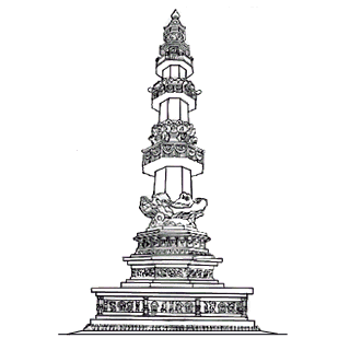 佛教的经幢,将佛经咒文写在长筒圆形的绸伞上,或写在旛盖上。刻佛经咒文於石柱上的叫石幢。唐