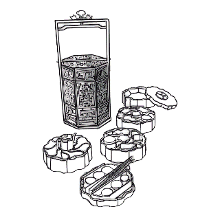 用以盛放食品、食具或其他礼物的,可提可挑的大盒子。