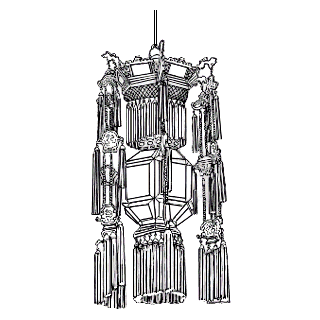 八角或六角形的灯,每面糊绢或镶玻璃,并画有彩色图画,下面悬挂流苏。原爲宫廷使用,故名。