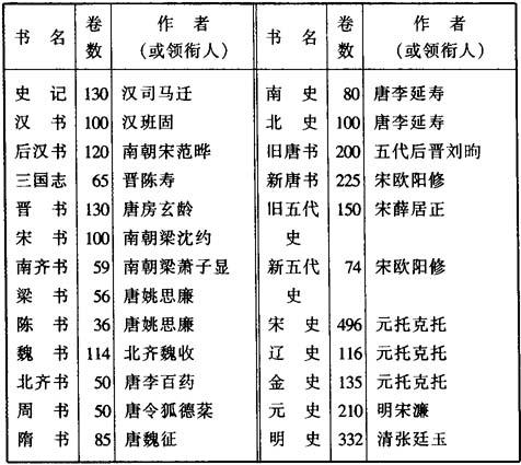 指二十四部纪传体史书。明有二十一史之目,清乾隆四年又增《明史》《旧唐书》《旧五代史》,合称二十四史。各史名称、卷数及作者(或领衔人)如下表:
