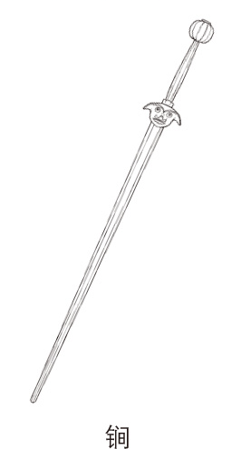古代兵器,金属制成,长条形,四棱,无刃,有柄。