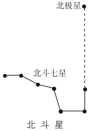 大熊星座的七颗明亮的星,分布成勺形。用直线把勺形边上两颗星连接起来向勺口方向延长约五倍的距离,就遇到小熊座α星,即现在的北极星。