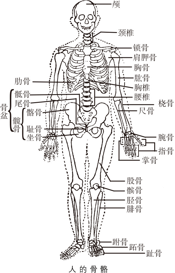 人和动物体内或体表坚硬的组织。分两种,人和高等动物的骨骼在体内,由许多块骨头组成,叫内骨骼;节肢动物、软体动物体外的硬壳以及某些脊椎动物(如鱼、龟等)体表的鳞、甲等叫外骨骼。通常说的骨骼指内骨骼。