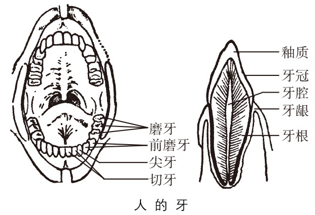 人和高等动物咬切、咀嚼食物的器官,由坚固的骨组织和釉质构成。人的牙按部位和形状的不同,分为切牙、尖牙、前磨牙、磨牙。通称牙齿,也叫齿。
