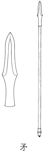 古代兵器,在长杆的一端装有青铜或铁制成的枪头: