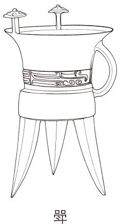 古代盛酒的器具,圆口,口上有两柱,三足。