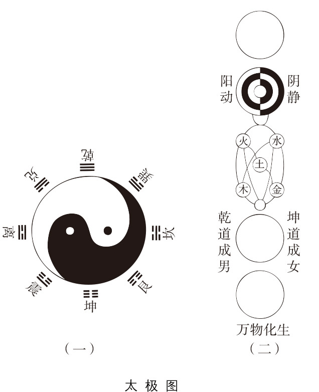 我国古代说明宇宙现象的图。一种是用圆形的图像表示阴阳对立面的统一体,圆形外边附八卦方位,道教常用它做标志。另一种是宋周敦颐所画的,代表宋代理学对于世界形成问题的看法。他认为太极是天地万物的根源,太极分为阴阳二气,由阴阳二气产生金、木、水、火、土这五行,五行之精凝合而生人类,阴阳化合而生万物。