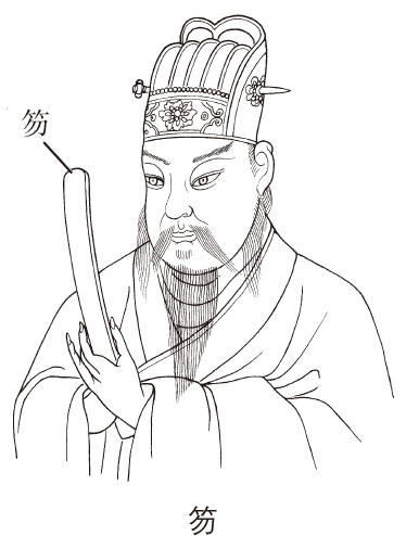 古代君臣在朝廷上相见时手中所拿的狭长板子,用玉、象牙或竹片制成,上面可以记事,后来只有大臣使用。