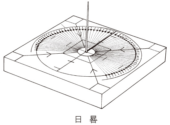 古代一种利用太阳投射的影子来测定时刻的装置。一般是在有刻度的盘的中央装着一根与盘垂直的金属棍